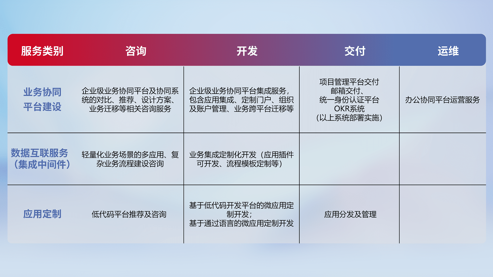 针对钉钉、、、、企微、、、、IDaas等平台级产品提供产品的规划、、、方案、、交付、、定制化开发等服务,,实现如统一协同办公、、、、智能客户服务、、混合会议管理、、、智能数据查询、、等业务场景,,实现数字化转型。。。